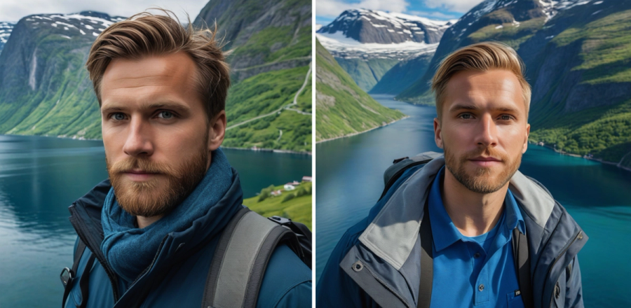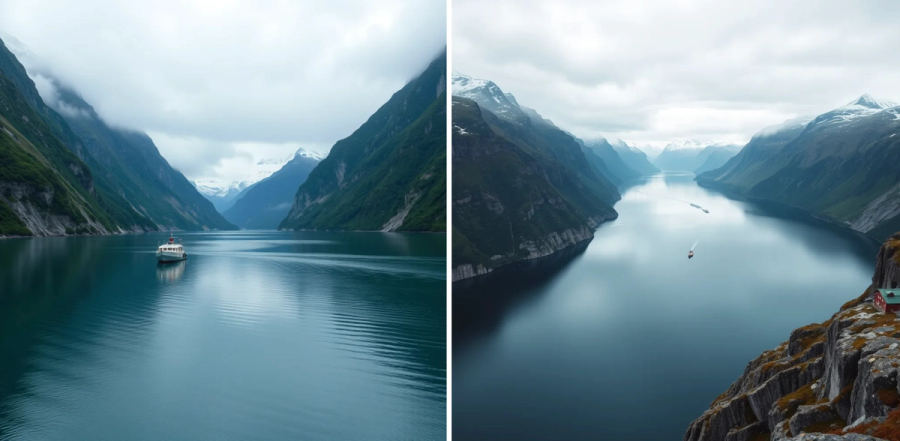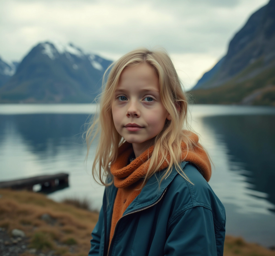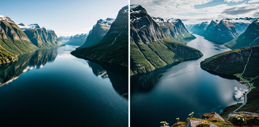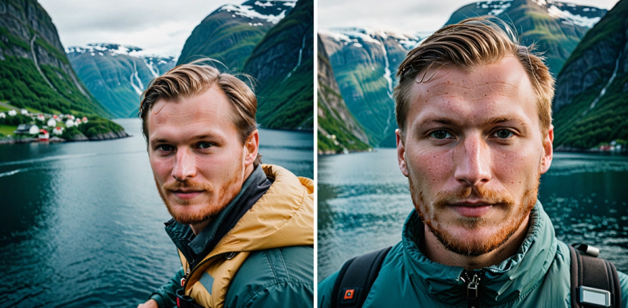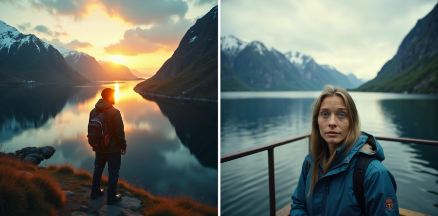 - Picture of the Norwegian fjords taken with Hasselblad camera, include a human looking in the camera