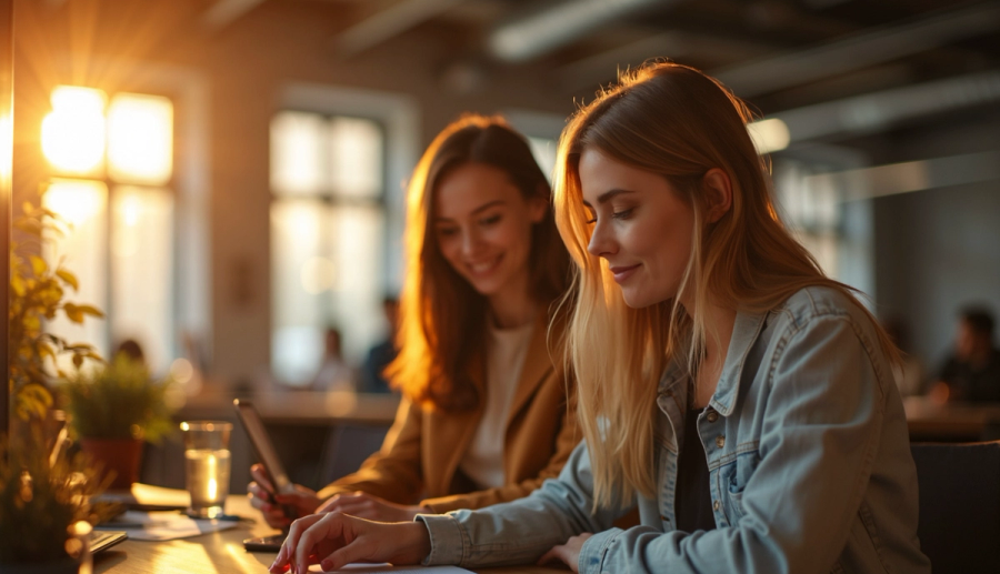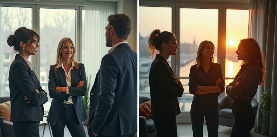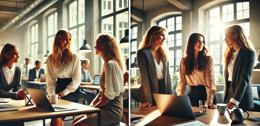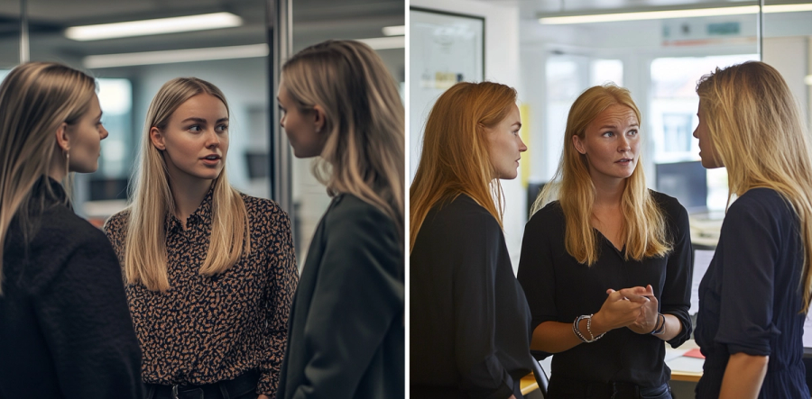 - filmic photo of a group of three professional Norwegian women in a office, talking
